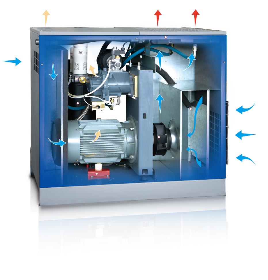 壓縮機冷卻系統(tǒng)由安裝在主電機上的大排量風扇提供冷卻風量,無需另裝專門的冷卻風扇,減少運動部件,降低故障因素,使機器運行更加可靠。
